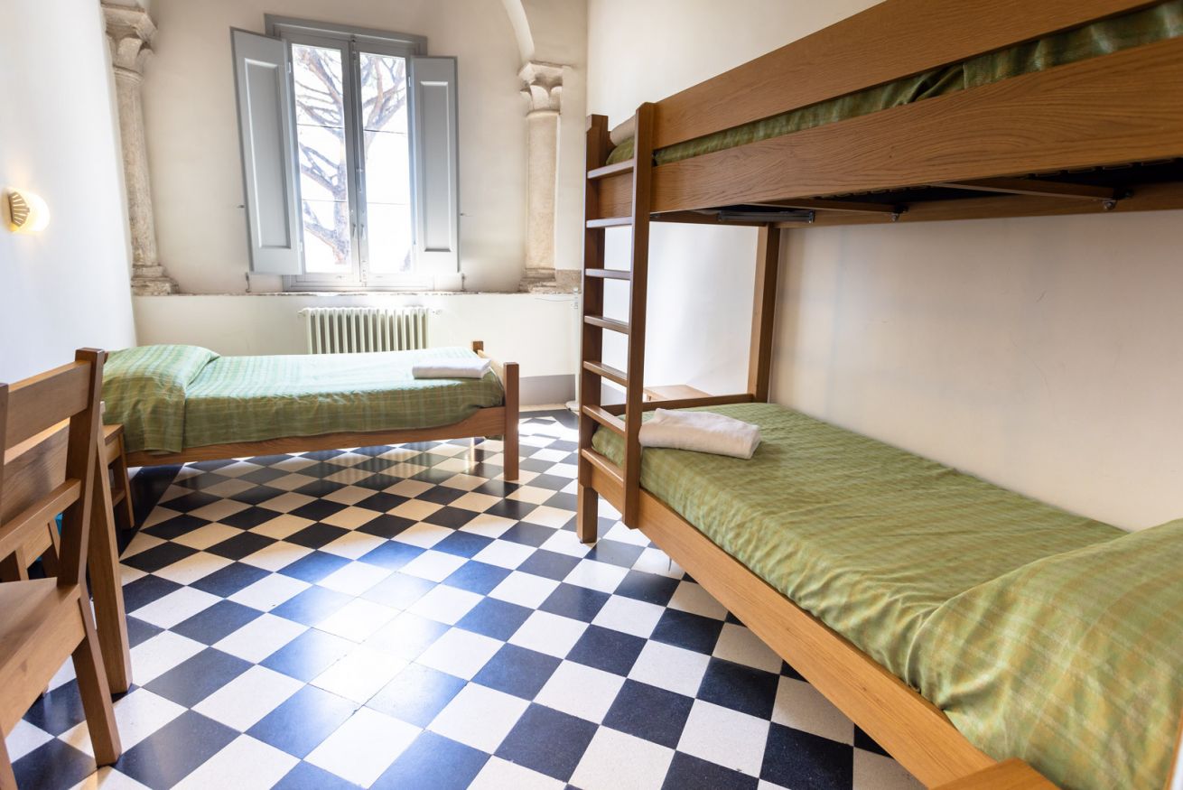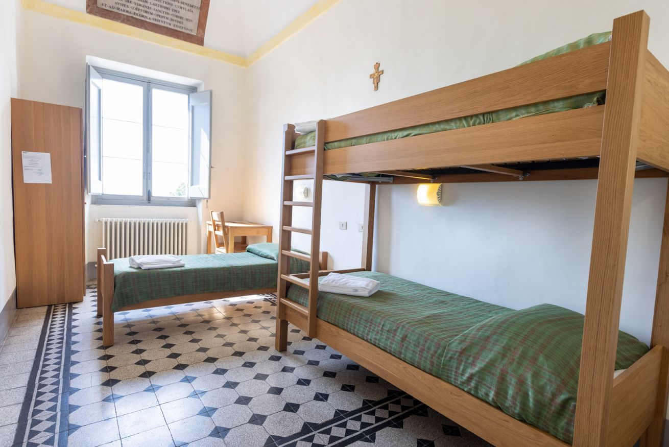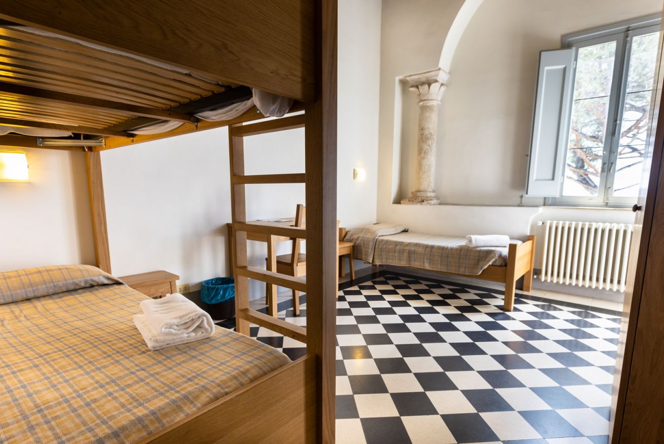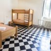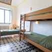 Chambre avec un lit simple et un lit superposé et salle de bain privative dans le couloir.