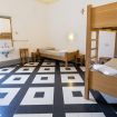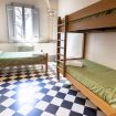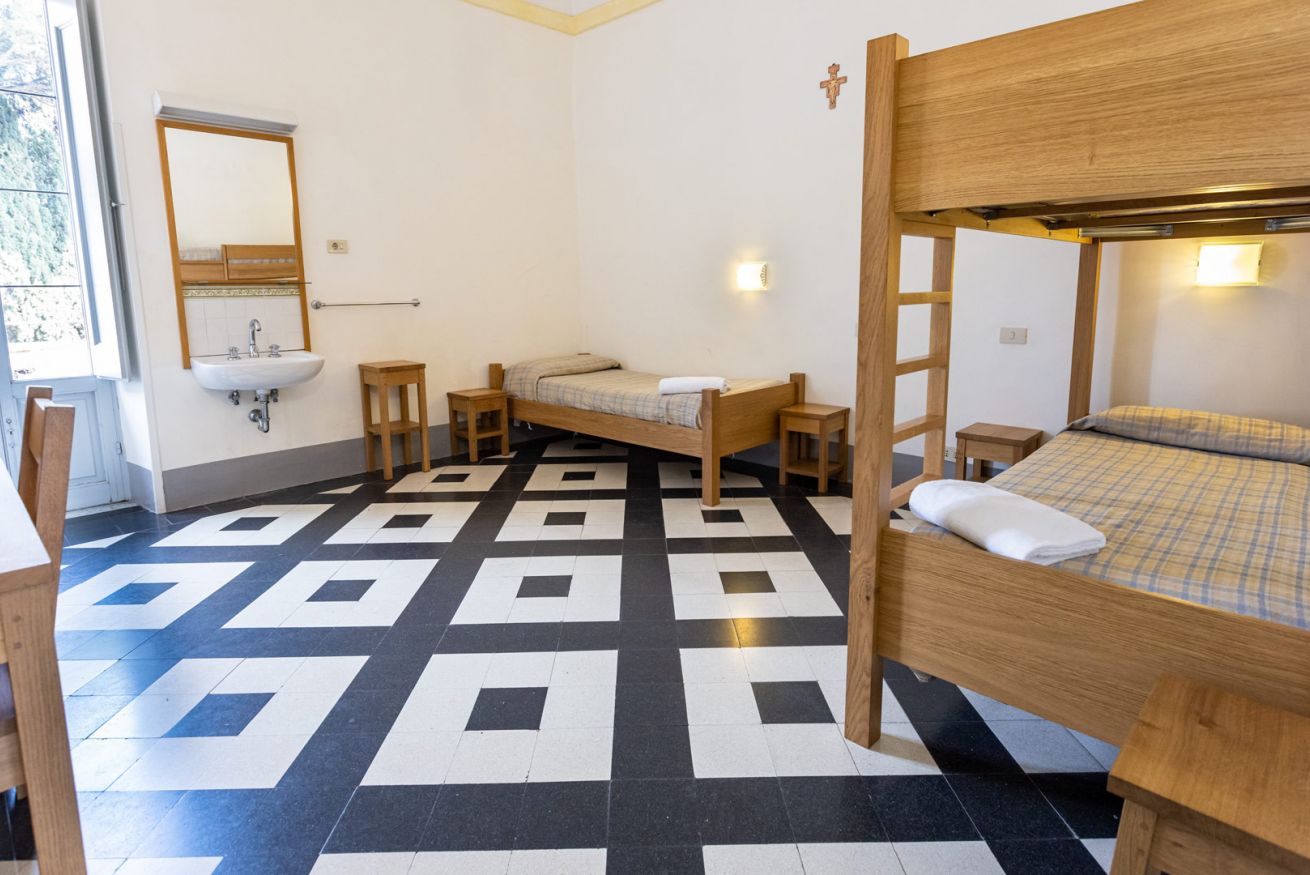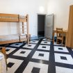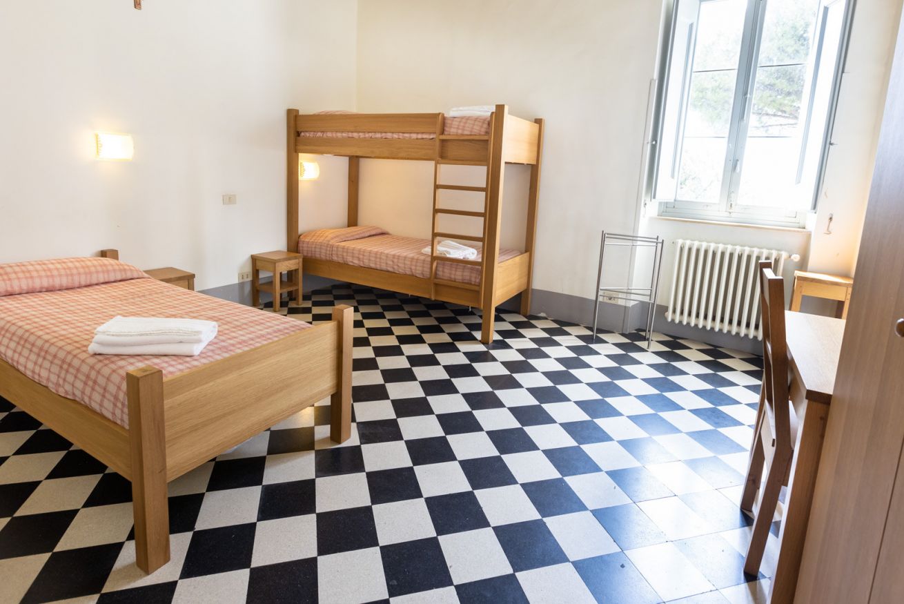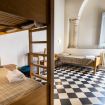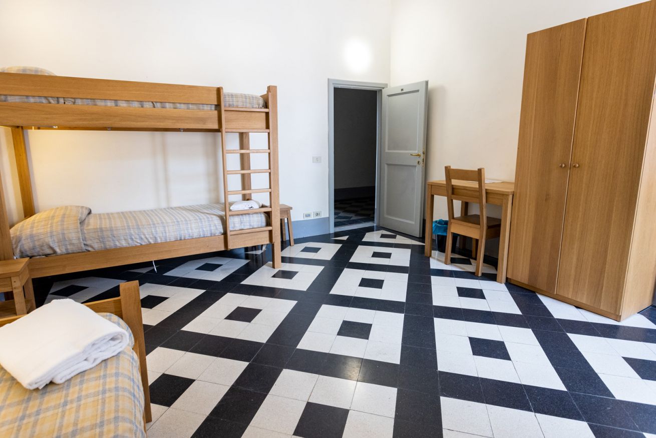 Chambre avec un lit simple et un lit superposé et salle de bain privative dans le couloir.