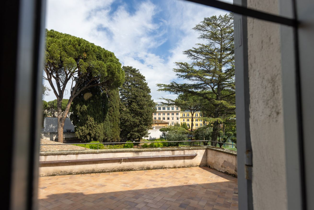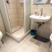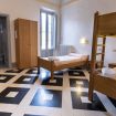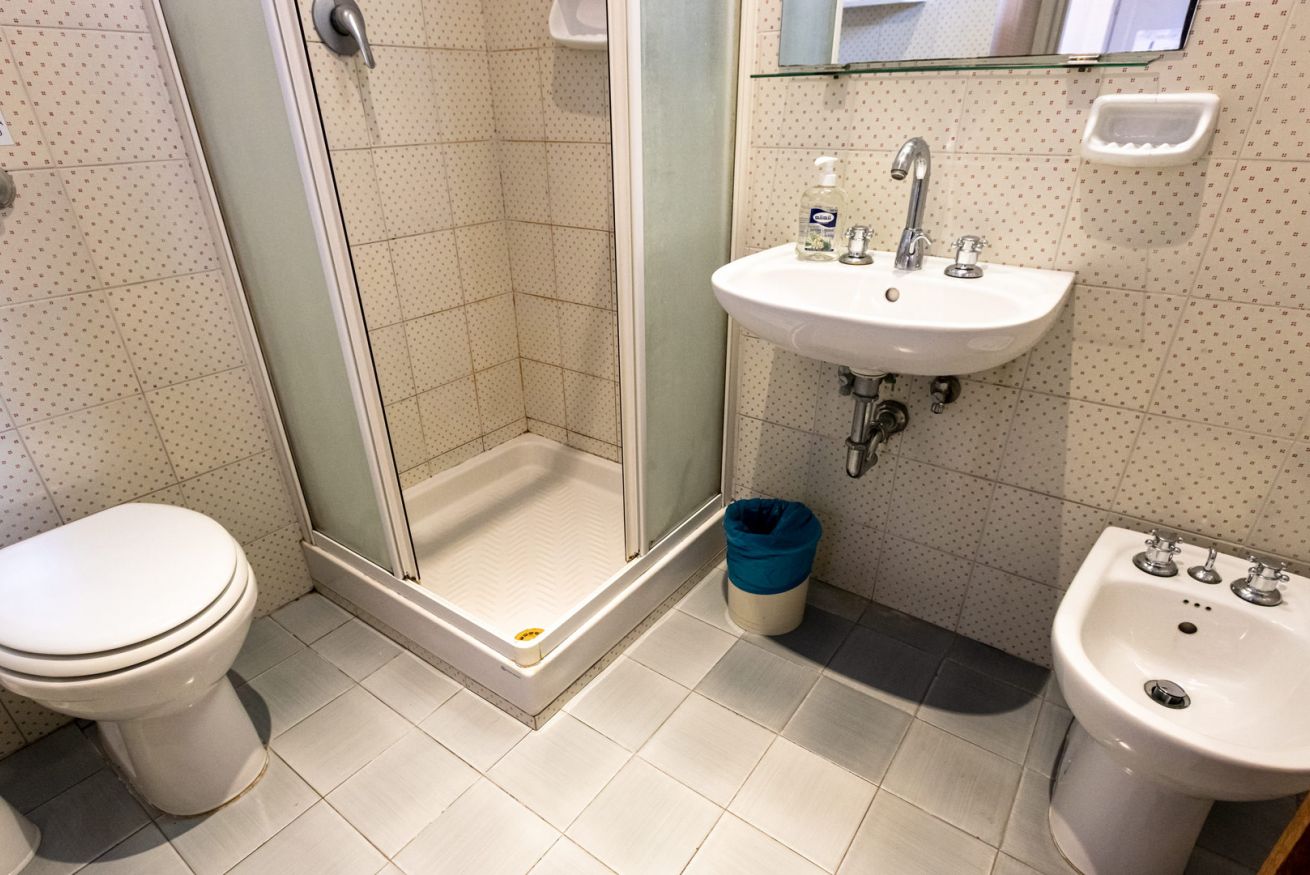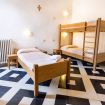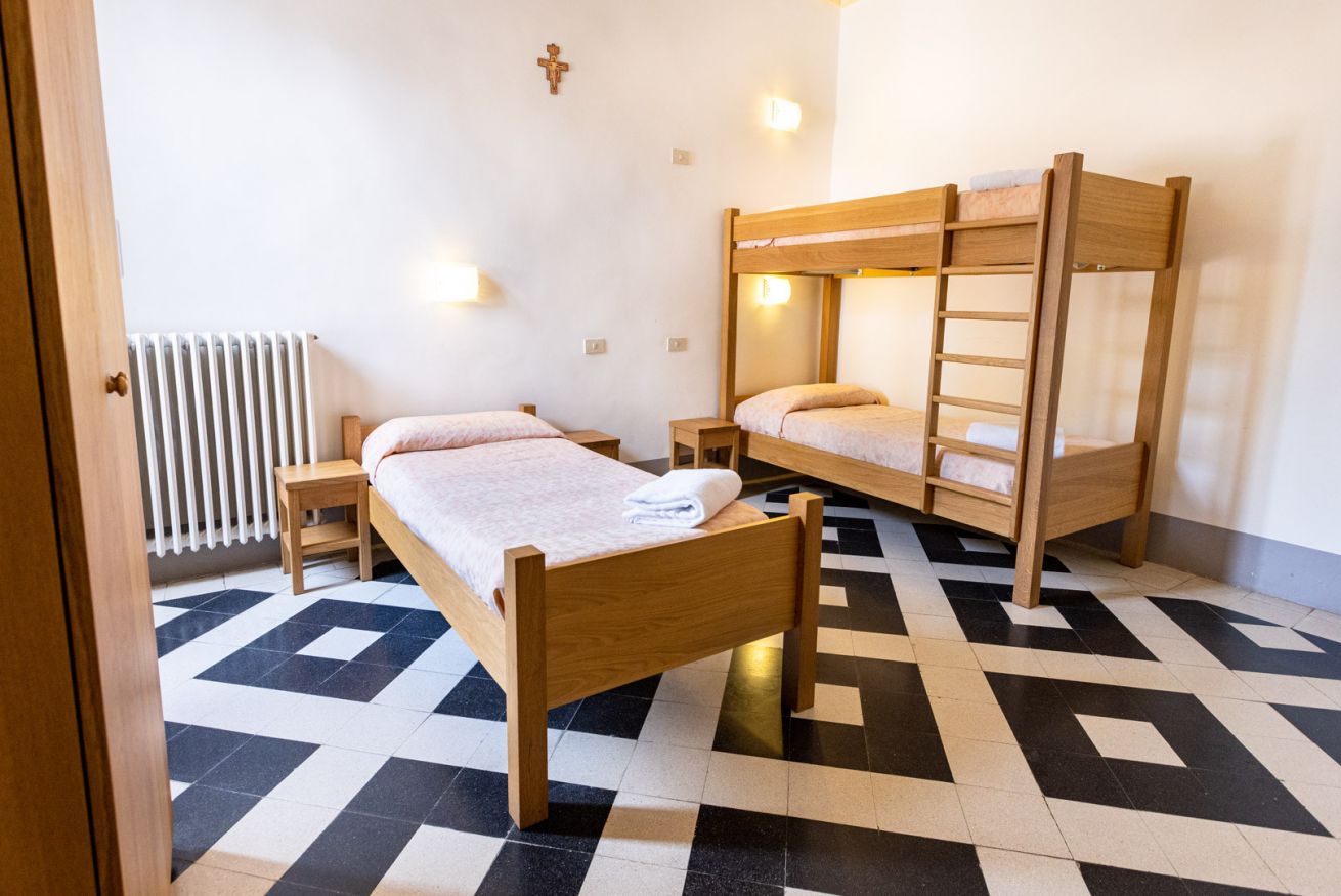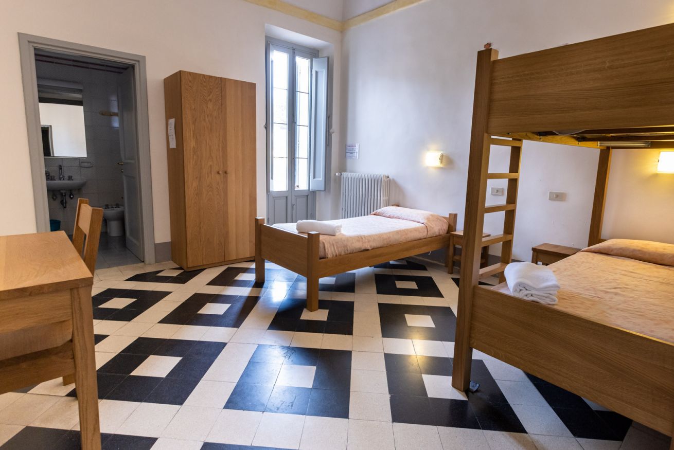Chambre avec un lit simple et un lit superposé et salle de bain dans la chambre.