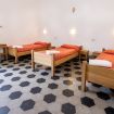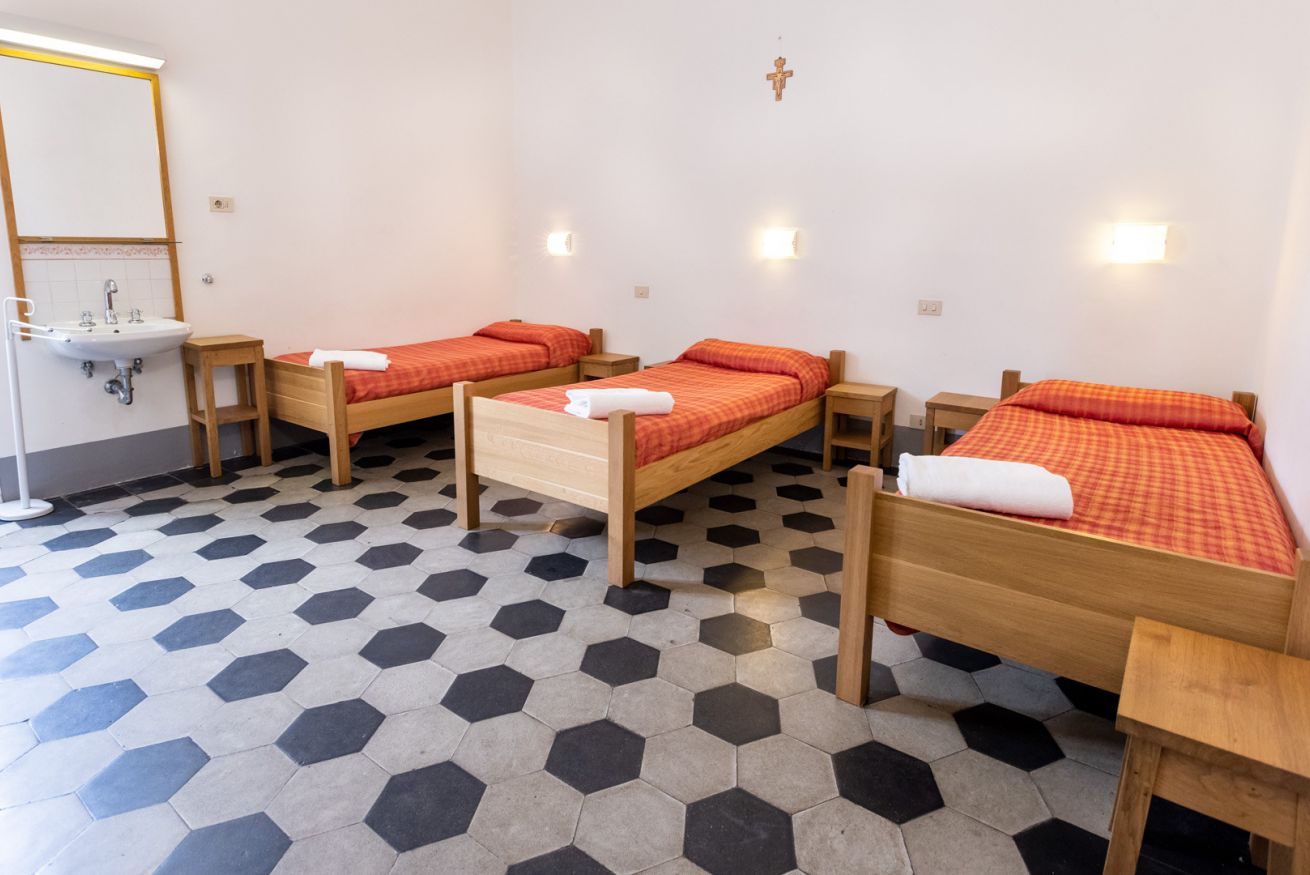 Chambre avec trois lits simples et salle de bain privative dans le couloir.